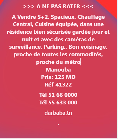 a vendre s+2, spacieux, chauffage central, cuisine équipée, dans une résidence bien sécurisée gardée jour et nuit et avec des caméras de surveillance, parking,, bon voisinage, proche de toutes les commodités, proche du métro