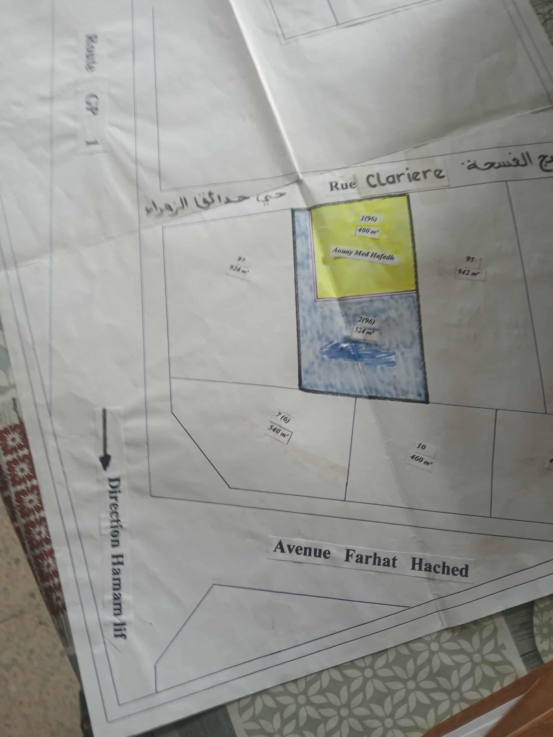 avec un titre bleu individuel,pour un enplacement stratégique à 30 mètre de gp1 sans intervention d’intermédiaire un terrain entier de 924 m2 ou deux lots séparés l’un 400m2 l’autre 524m2 veuillez contacter le 29335136 ou le 98909569