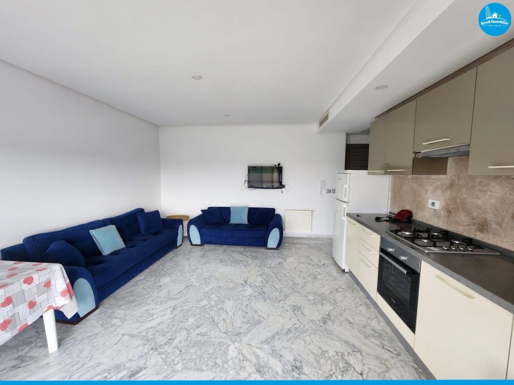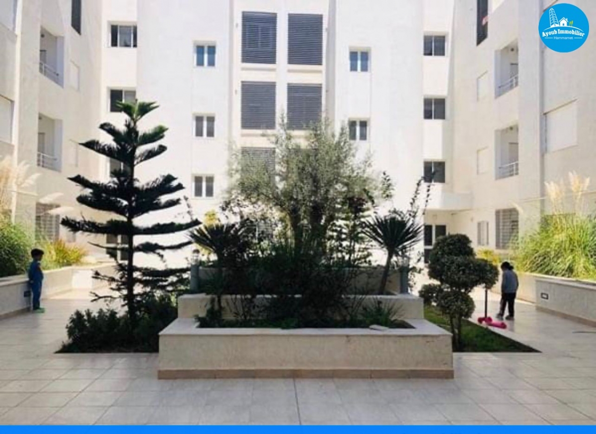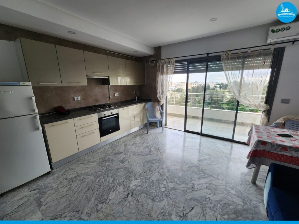 studio à vendre ou à louer à hammamet nord, zone hotel sultan, dans une résidence gardée et sécurisée. le studio fait 80m² de surface et il se compose d’un salon lumineux donnant sur une terrasse avec une vue de mer dégagée, une kitchenette, une salle d’eau et une chambre avec dressing et une terrasse. le studio est totalement chauffé et climatisé et il bénéficie d’une place de parking au sous-sol.