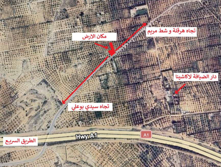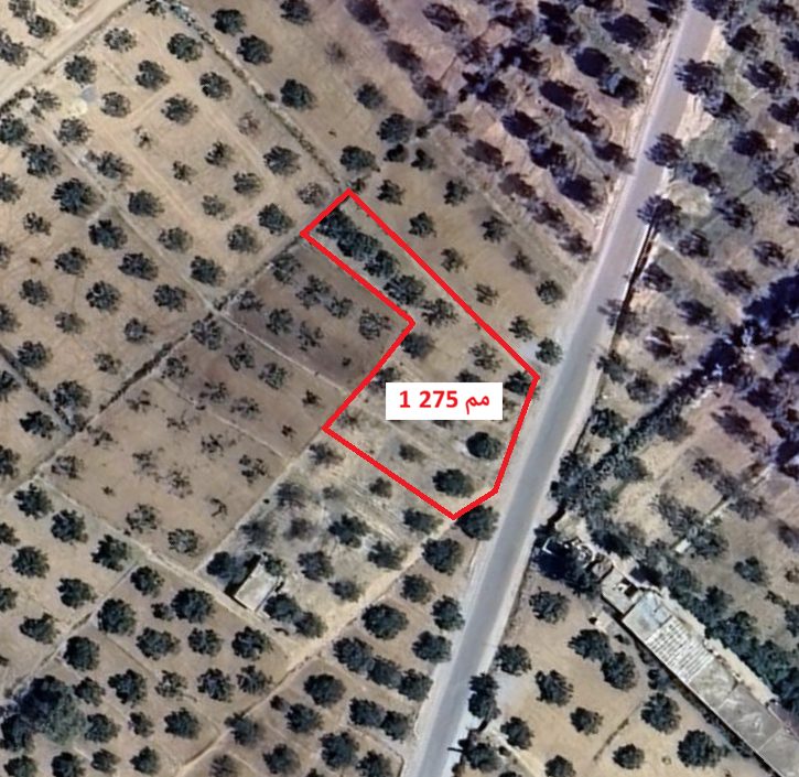terrain à vendre, mesurant 1275 mètres carrés, contenant 16 oliviers, surplombant une route pavée menant vers sidi bou ali du côté de l’autoroute et vers chott meriem et hergla du côté de sebkha.
