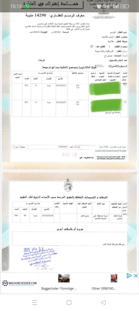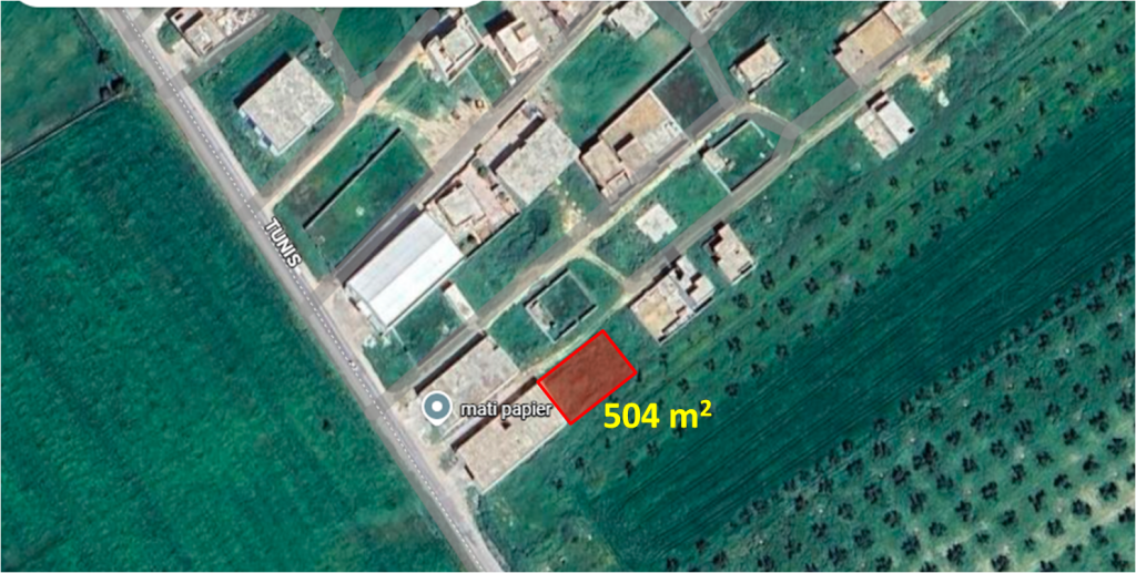 terrain à vendre à mornaguia d’une superficie totale de 504 mètres carrés, enregistré au registre foncier et disposant d’un titre de propriété, donnant sur une route de 8 mètres de large.