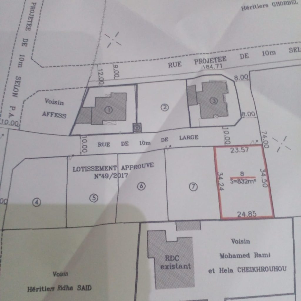 il s’agit d’un terrain de surface 845 m2 situé au route lain km 8 zanket lain de dmension 23*36 bon entourage et calme prix a negocier