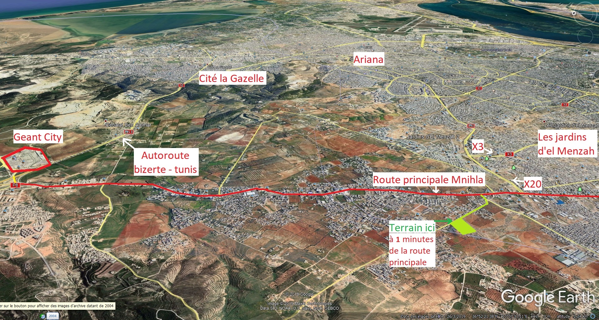 surface total de 350 m² avec environ 20 mètres de façade pour 170 000 dinars (soit environ 485 dinars/m², négociable) avec visite sur place.