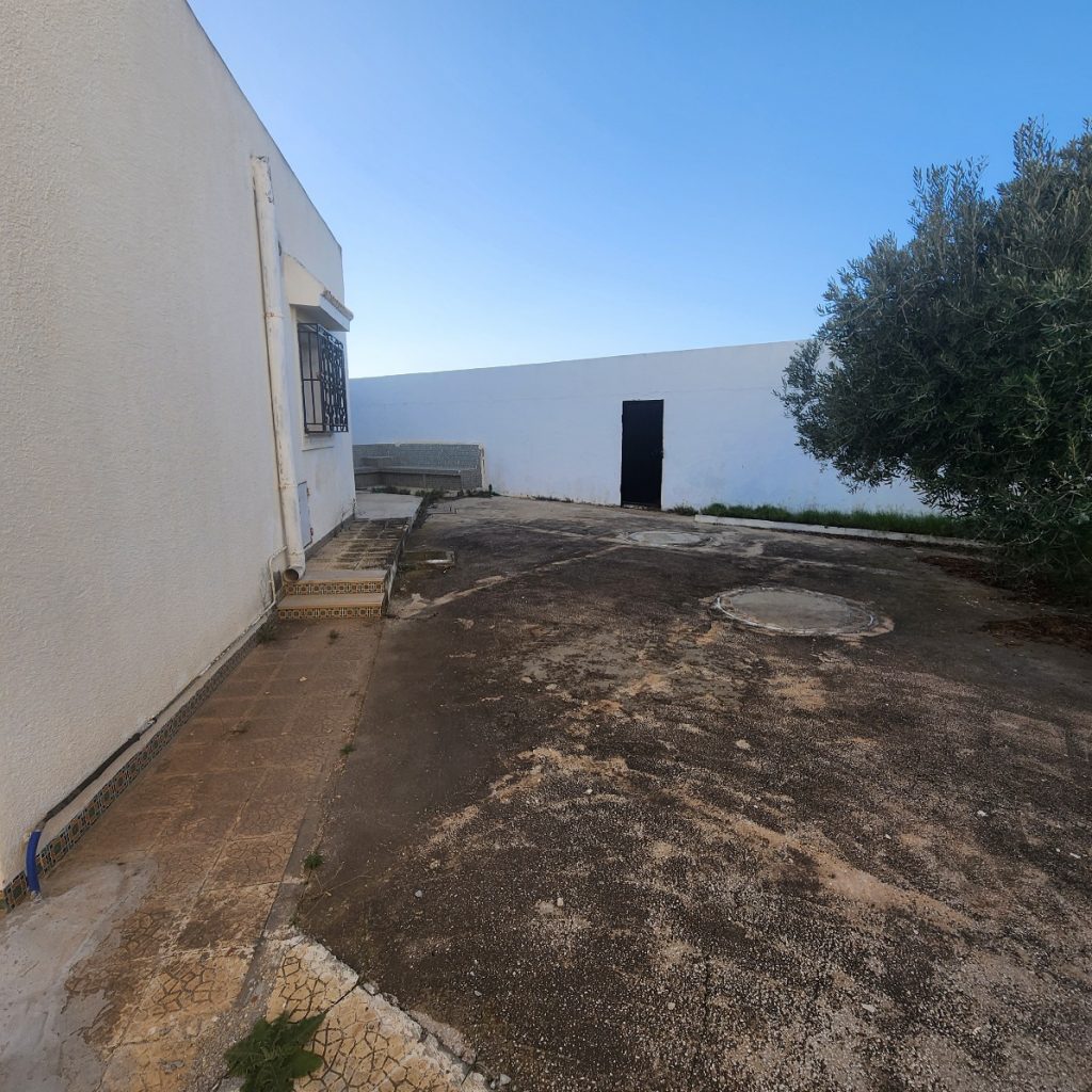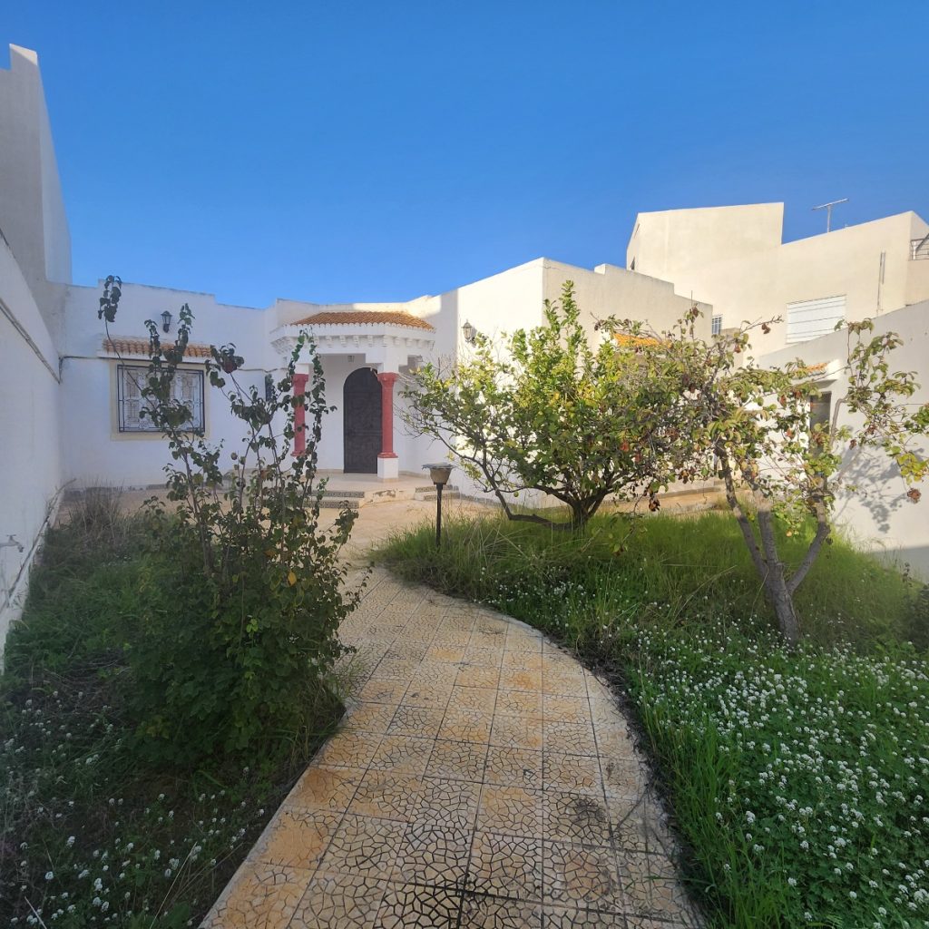 villa bâtie sur un seul niveau compose de 3 chambres , salon , salle de bain , cuisine , garages et studio et jardin .
